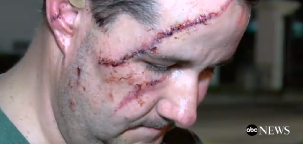 It was standing in front of me and I tried to turn left real quick and get back in the house, and caught an uppercut from a brown, or a black, bear.”