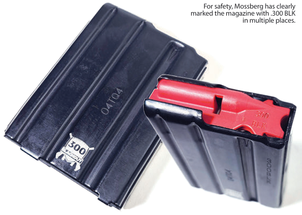 The rifle I got came with one 10-round-capacity magazine. The magazine is yet another item where Mossberg went above the call. The mag for this gun is clearly marked as .300 Blackout. A special note here on this point. Be very careful to separate any mags loaded with .300 BLK from your .223/5.56. The internet is replete with images of people who fed the wrong ammo onto their guns and experienced catastrophic issues. Stay safe and mark your magazines. This marking by Mossberg may be no big deal to some, but I find it to be a reflection on Mossberg and their attention to small things to make life easier on the shooter.